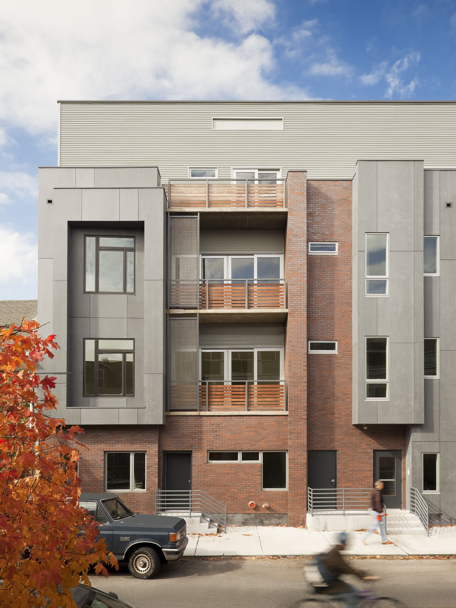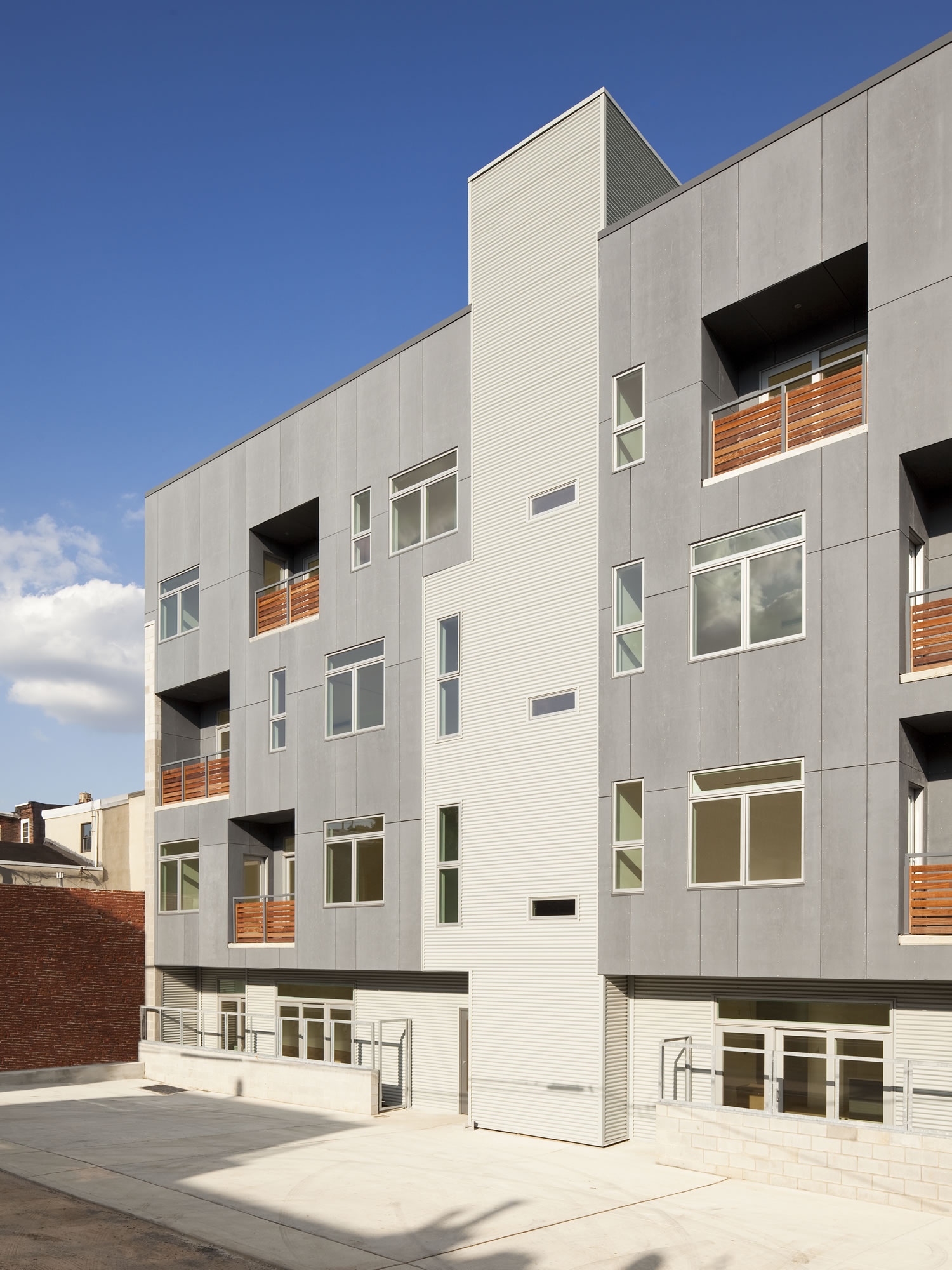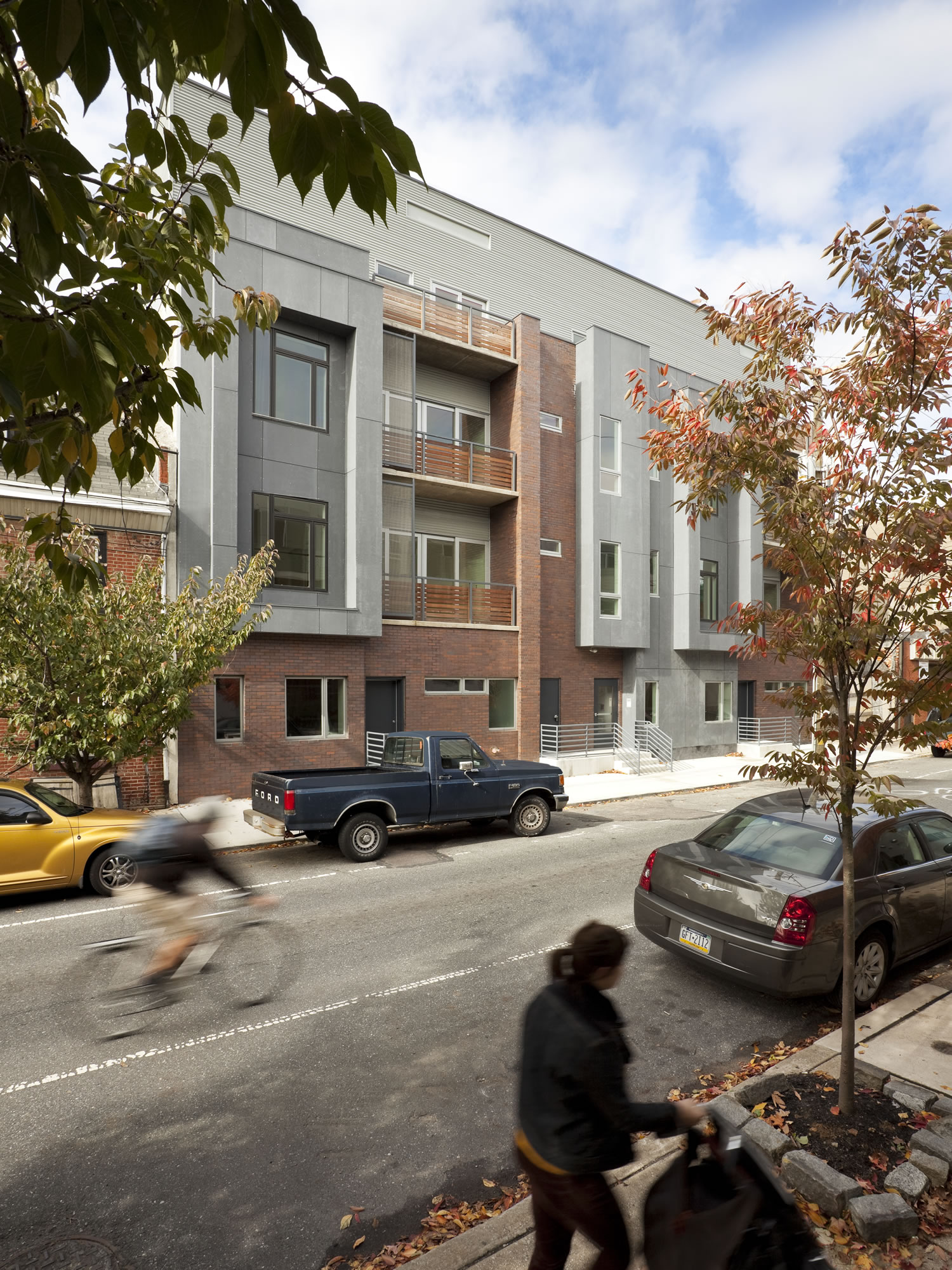 This new four-story condominium was constructed in Northern Liberties in Philadelphia. The building featured large span open spaces in the units and many projections and recesses on the north and south faces of the building. These features, as well as the balconies on some of the units, dictated the use of steel structural framing and concrete slab for the floor areas.